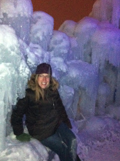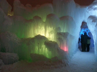 Later we visited the Ice Castles at the Mall of America. It started to snow and the flakes fell softly all around us. The ice walls were lit with bright colored lights, and narrow passages wound around the ice castles. We found ice benches to sit on, little nooks in walls to peek into, and interesting descriptions about how the ice castles were made.
