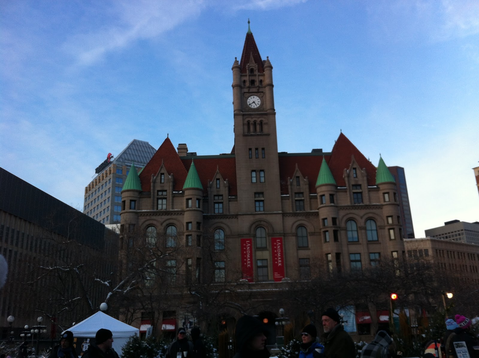 We arrived in Rice Park, a park in Saint Paul surrounded by stately buildings such as the Landmark Center, the James J. Hill Library, the St. Paul Hotel and the Ordway Center for the Performing Arts.