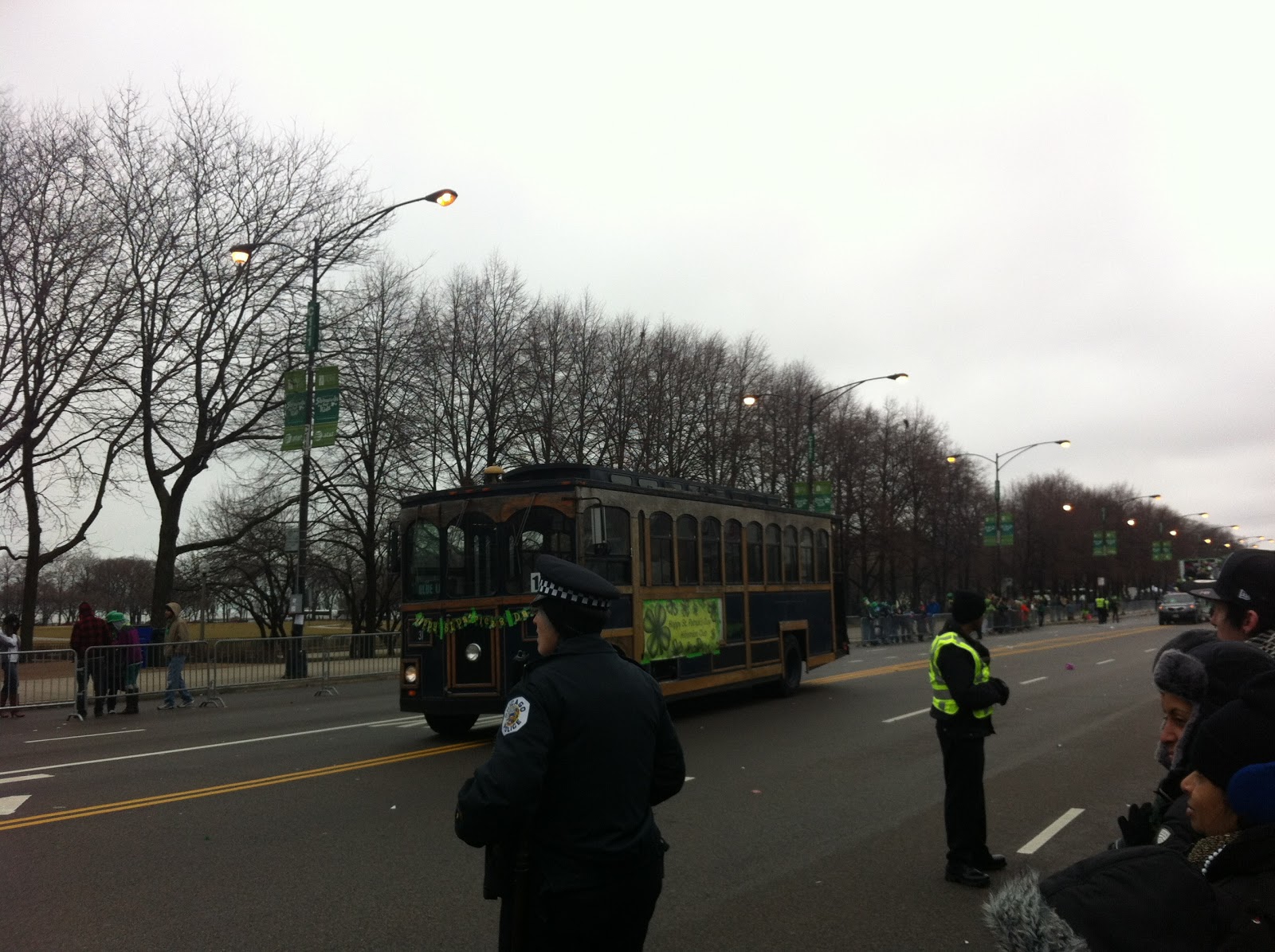 And then we watched part of the Chicago Saint Patrick’s Day Parade. Many people lined the street, as marching bands and floats made their way down the street. I’ve heard the parade is about 3 hours long, but we only see part of it. It was still fun to see everyone in the parade in festive green outfits, smiling, handing out candy and green beads, and cheering “Happy St. Patrick’s Day!” throughout the parade.