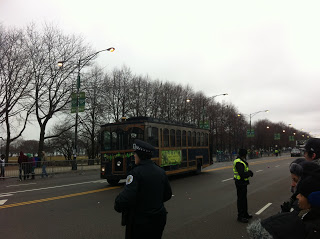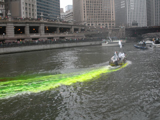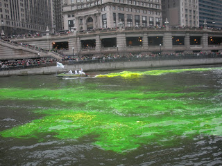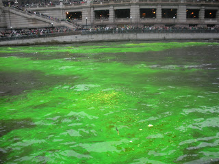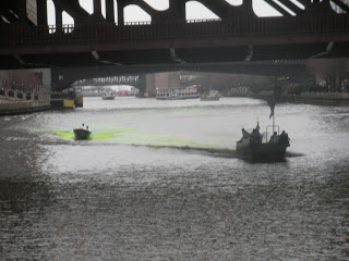 The boat stayed at its dock near the Michigan Avenue Bridge until after the river had been dyed green. The crowds lined the banks of the river and the bridges, huddling in the cold with coffees and other hot drinks, wearing green hats, shirts and beads. I thought I could hear sounds of bagpipes in the distance at times.