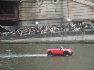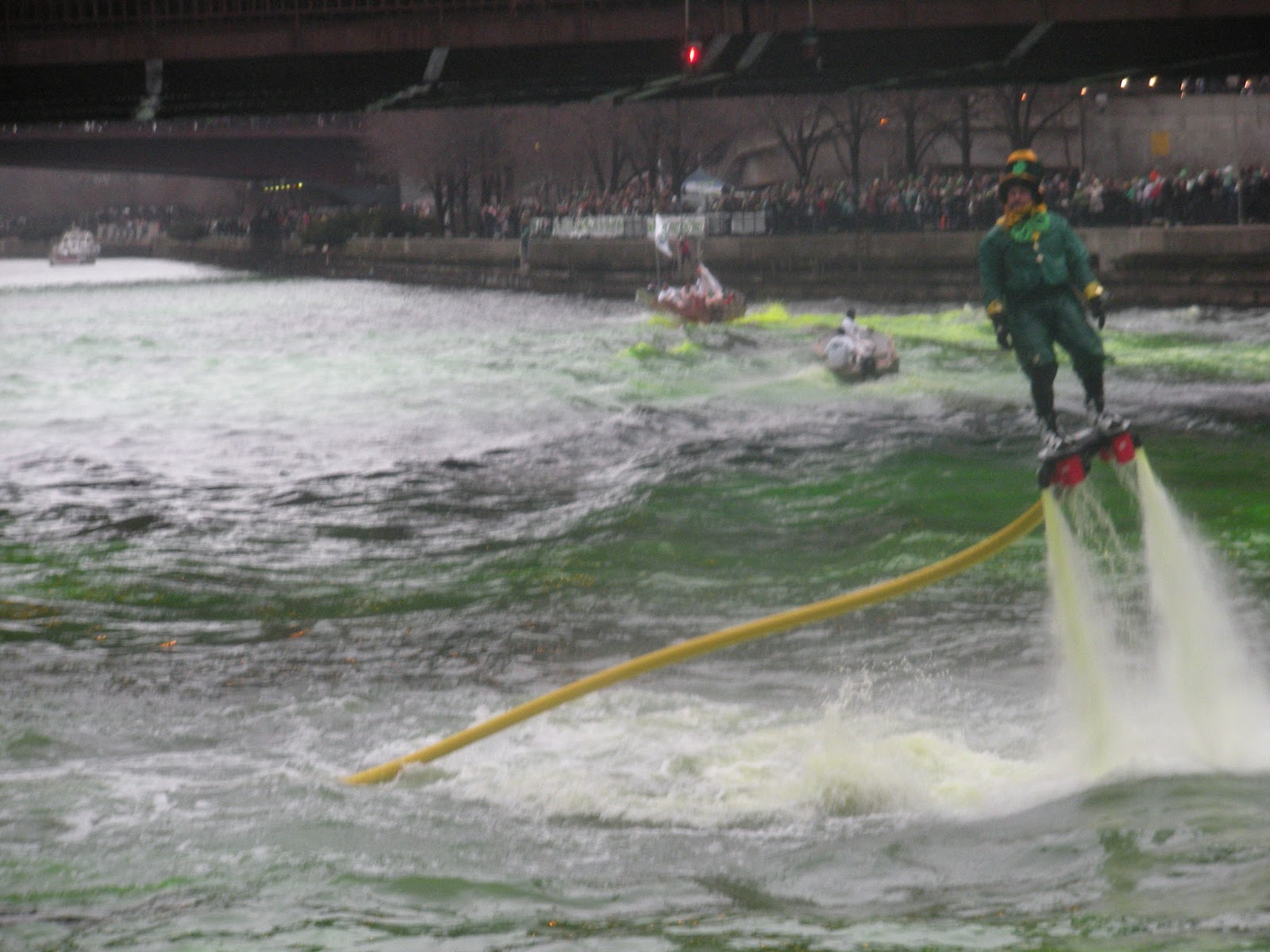 After the boats continued back down the river, another boat came along, with a long hose behind it. On the end of the hose was a small platform, which kind of looked like a skateboard, with a leprechaun standing on it. The hose popped in and out of the water, swirling from side to side in the water, with water surging into the river from the bottom of the small platform under the leprechaun’s feet, which seemed to help to turn the water even more green.