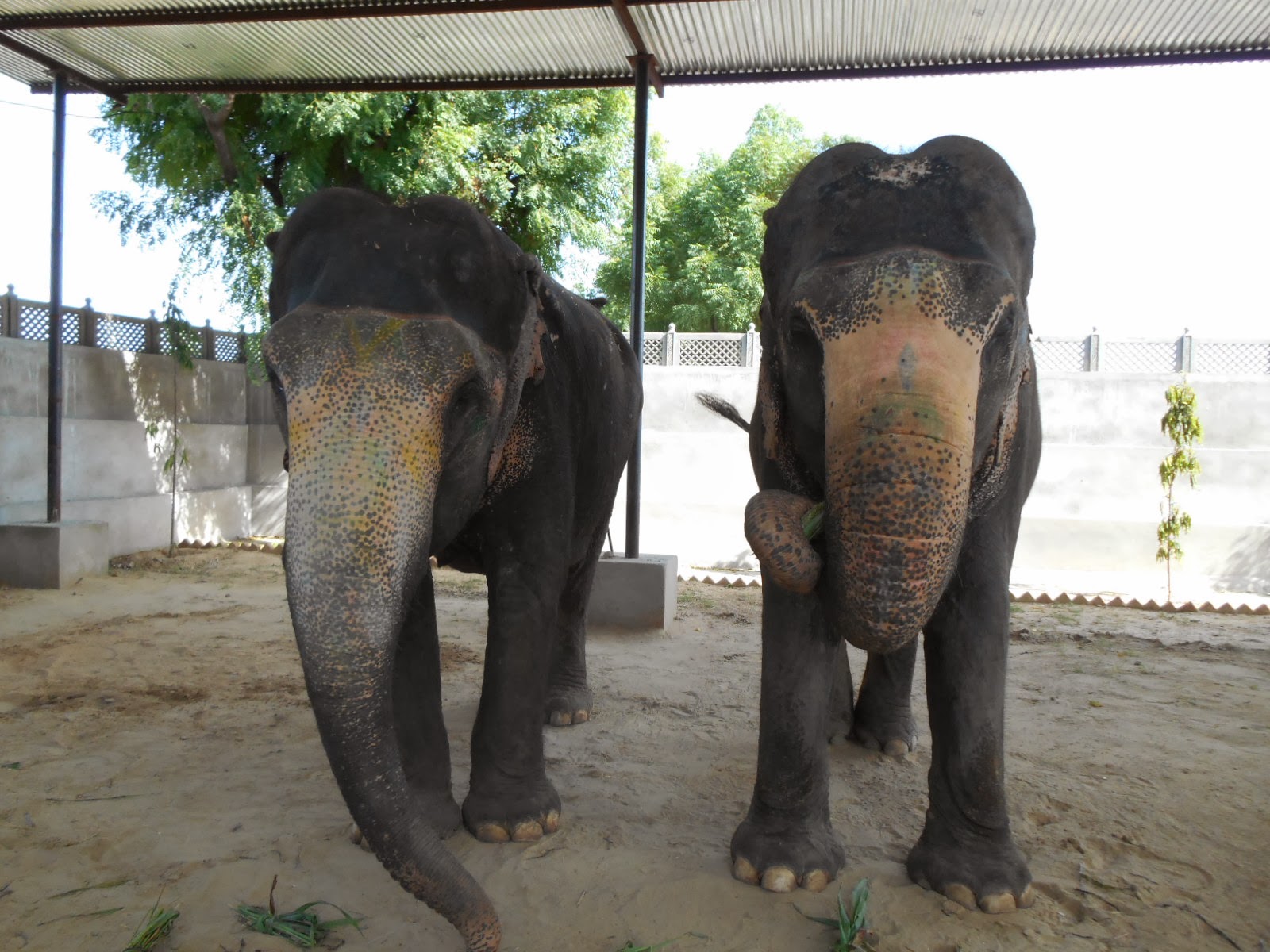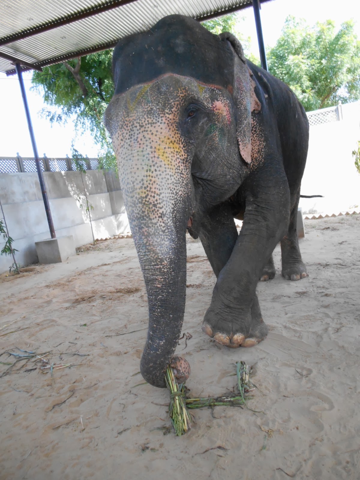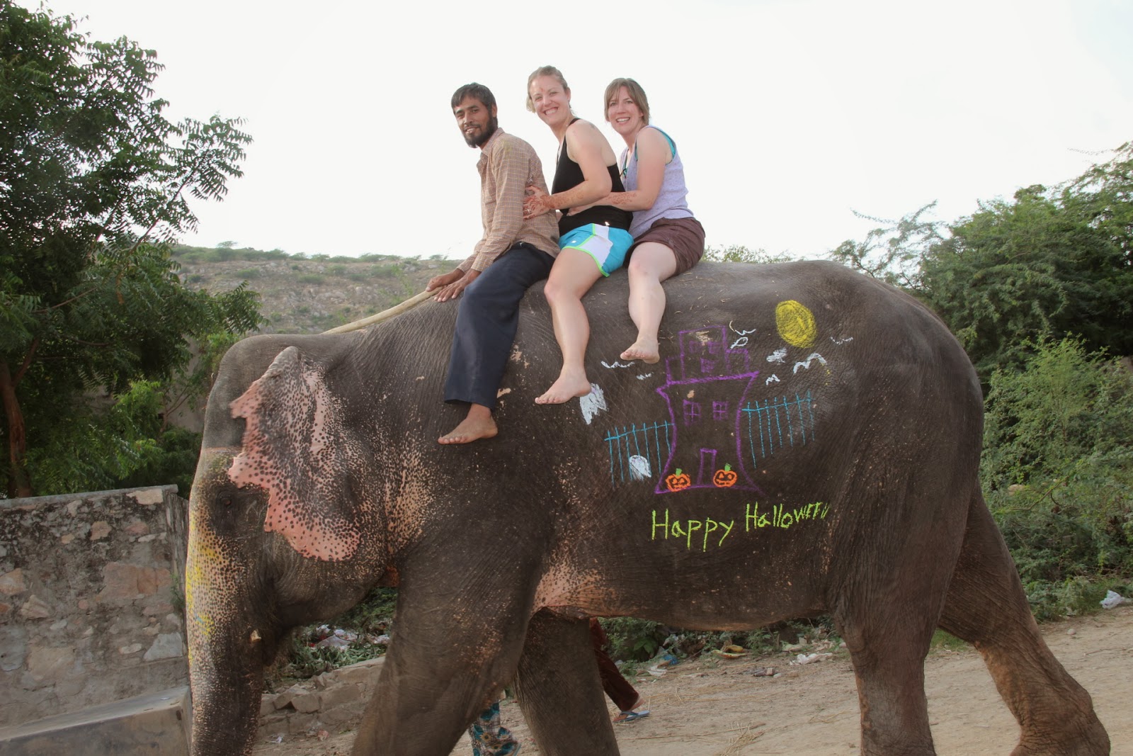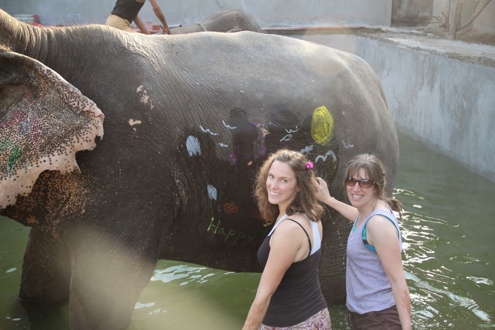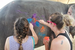 The team gave us several cups of paint with special brushes that we could use to paint designs on the elephants, which is commonly done in India. We could paint whatever we liked. I painted some flowers and vines on one elephant and one of my friends helped me. One of my friends drew a haunted house scene on the side of another elephant (we were there around Halloween).