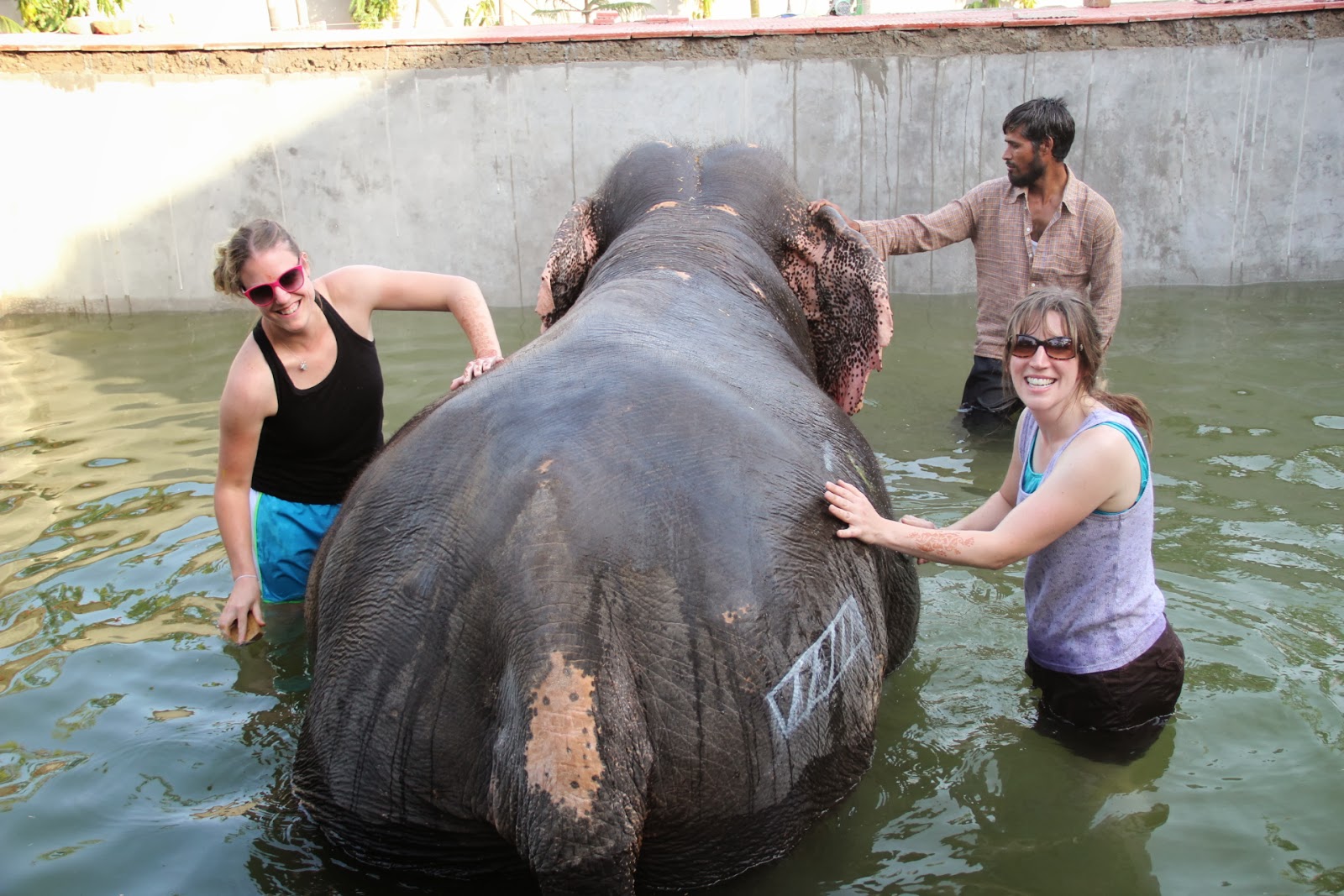 Once we got back to the building, the staff led the elephants into large pools filled with water. We were prepared for this part and had worn our swimsuits. We followed the elephants in with brushes and helped the staff clean the elephants, washing off the paint.