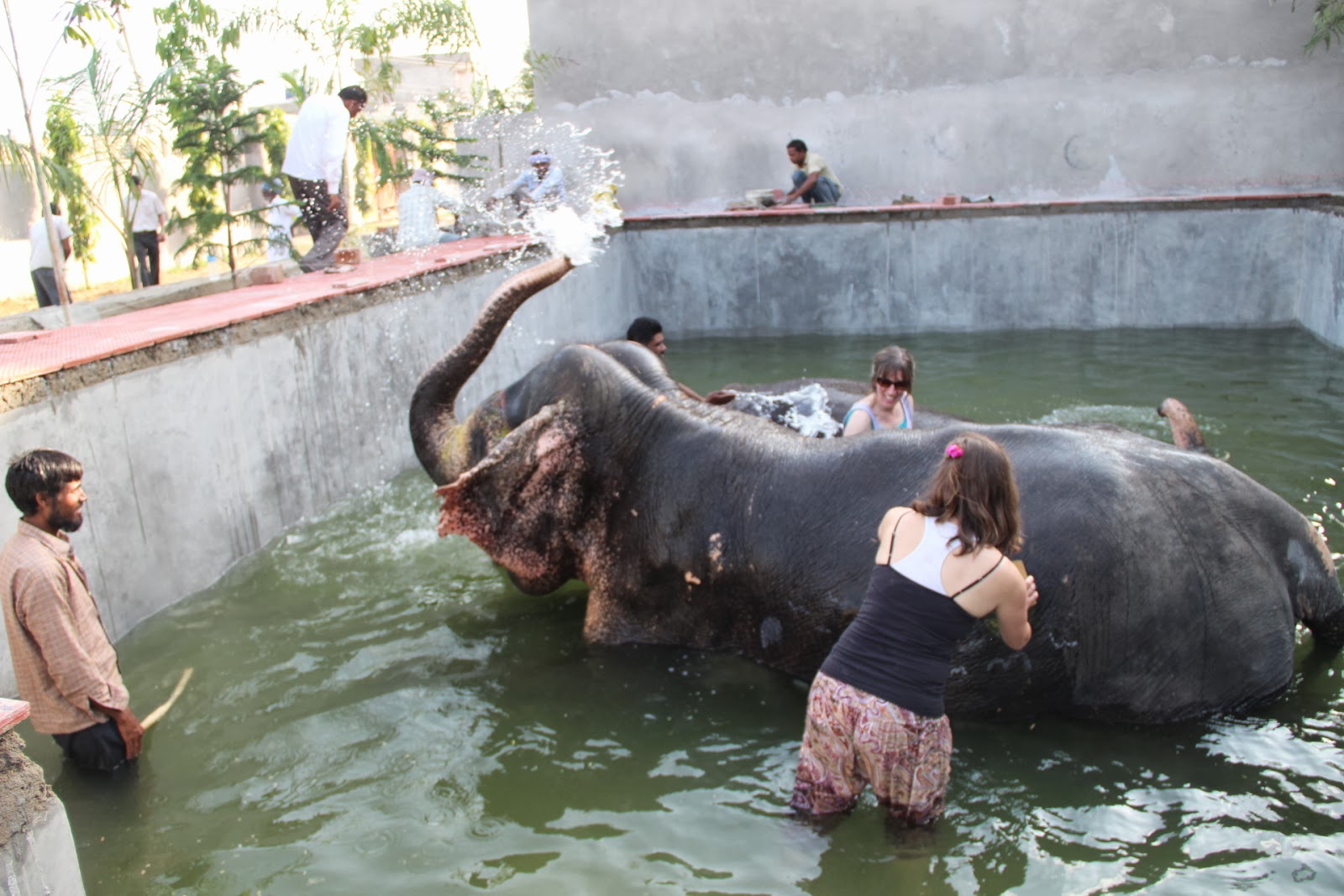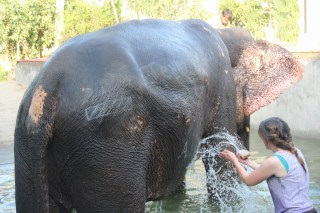 The elephant I was washing liked playing in the water. She would stick her trunk in the water and then spray her back, along with spraying me and my friend, with the water. We got soaked! But it was fun.